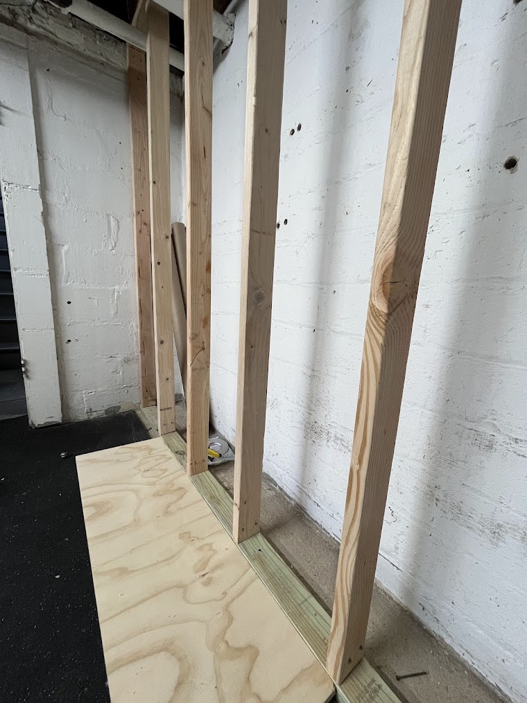 My garage has cinder block walls, which are strong vertically but not designed to handle shear loads, so I started by building a stud wall that I could trust to safely transfer weight into the floor. I constructed the stud wall using 2x4's, with pressure-treated lumber for the floor. I used tapcons to secure the floor plate and both side walls, and some big nails (see full part list below) to attach to a joist in the ceiling. There are a bunch of radiator pipes around there, so I had to build the stud wall in place. I spent a ton of time making sure the studs were plumb, straight, and evenly-spaced. Toe-nailing was tight, so I ended up using wood screws for a lot of it.