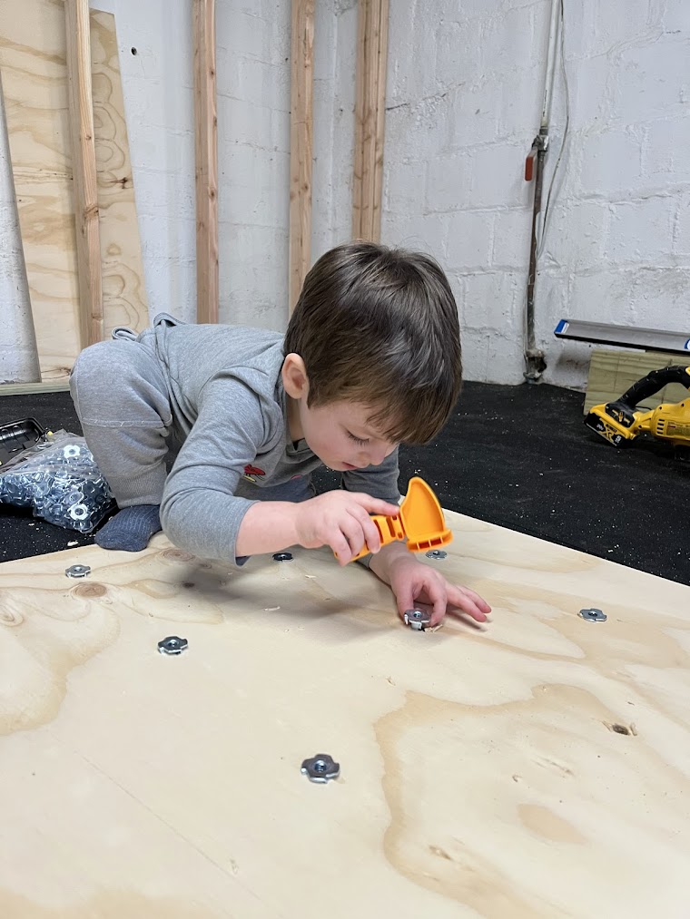 I introduced the rest of the plans slowly as we worked on them, and the excitement was high throughout. When we ordered all of the lumber for the climbing wall, we spent a while playing with it on the floor - 2x4's make great balance beams, highways, and fences for animal farms =)